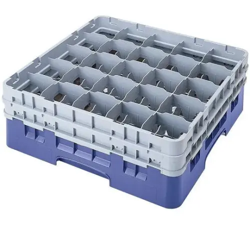 This Cambro 3.5" Stemware & Tumbler Glass Rack - Camrack [25S738-151] is a dish rack for cups with 25 compartments. Each compartment can hold a cup with a max diameter size of 3.5 inches and a max height of 7.75 inches. This square shaped cup rack fits in most commercial dish washers and makes cleaning cups and other glassware extremely easy. Thanks to the polypropylene plastic used in this construction, this cup rack is extremely durable and heat resistant. Comes in a set of 3.