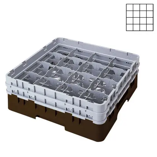 This Cambro 4.375" Stemware & Tumbler Glass Rack - Camrack [16S800-184] is a dish rack for cups with 16 compartments. Each compartment can hold a cup with a max diameter size of 4.375 inches and a max height of 8.5 inches. This square shaped cup rack fits in most commercial dish washers and makes cleaning cups and other glassware extremely easy. Thanks to the polypropylene plastic used in this construction, this cup rack is extremely durable and heat resistant. Comes in a set of 2.