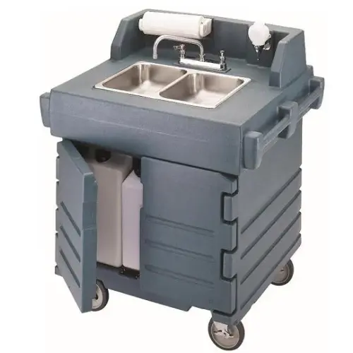 This 41" Portable Hand Sink Cart - CamKiosk [KSC402220-519] from Cambro is portable add-on (or standalone) portable hand sink for Cambro's CamKiosk carts. The cart is made using polyethylene plastic which is water-resistant and durable. The cart comes with two stainless steel sinks, two 5 gallons fresh water tanks, two 7.5 gal. waste water bins, a hand soap dispenser and a paper towel roll holder. It also includes casters, two swivel with brakes and two fixed. Note: This item is not low-lead compliant and is not approved for sale in California, Louisiana, Maryland and Vermont.