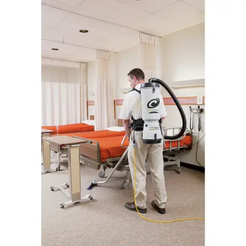 The ProTeam 107142 10 qt. LineVacer backpack vacuum cleaner with Xover floor tool kit is specifically designed for use in environments where controlled air quality is important. This vacuum boasts industrial HEPA filtration that captures up to 99.97% of airborne particulates that are 0.3 microns or greater in size when used in a 2283 square inch filtration area. It’s perfect for medical facilities, clean rooms, computer labs, and other areas where air quality is monitored or must meet certain standards. Plus, its backpack design makes it ideal for easily cleaning under and around tables, chairs, or other furniture. This vacuum comes with a 1 1/2" diameter static dissipating vacuum hose, two Intercept Micro filters, and a 50’ extension cord so you can clean a wide area of floor space before having to find a new outlet. The vacuum harness is designed with ergonomic, mountaineering style backpack technology to distribute weight across the hips for user comfort. The ProTeam 107142 is CRI certified and requires a 120V electrical connection for operation. Please consult the Specification Sheet for additional details. Xover floor tool kit D includes: - 14" Xover floor tool - 42" to 59" aluminum telescoping wand - 17" crevice tool - 3" dust brush with reducer - 5" upholstery tool