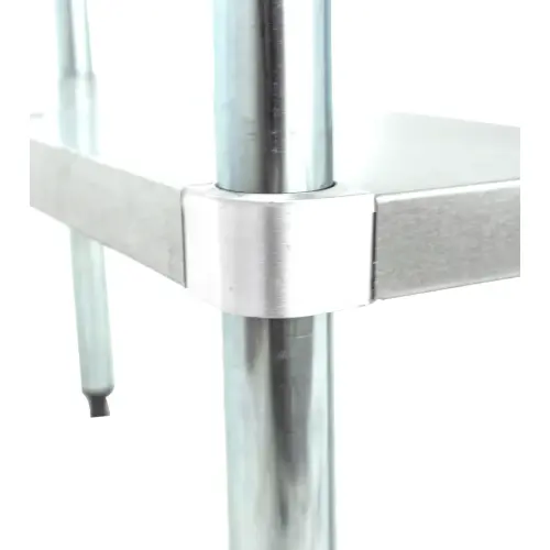 This commercial work table includes galvanized steel legs and sockets which are corrosion resistant. These work table legs are durable, manufactured for heavy duty commercial usage. The legs include adjustable plastic bullet which allow you to level the table on uneven floor surfaces for maximum stability and weight capacity.
