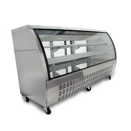 This refrigerated curved deli case is modern and sleek. The stainless steel exterior and coated steel is sharp and attractive. The rounded corner inside makes it easy to clean. The curved glass makes it look like there is no barrier between your product and your guests.